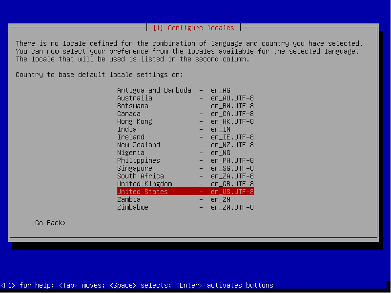 4. selanjutnya anda akan diminta untuk menentukan locales silahkan pilih "United States - en_US.UTF-8"