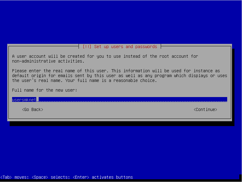 16.lalu anda diminta untuk memasukan full name dari user baru yang akan anda buat masukan tanpa sepasi contoh "usersmknet" lalu tekan enter