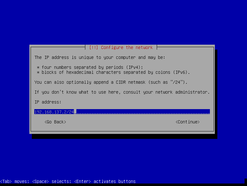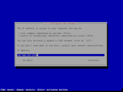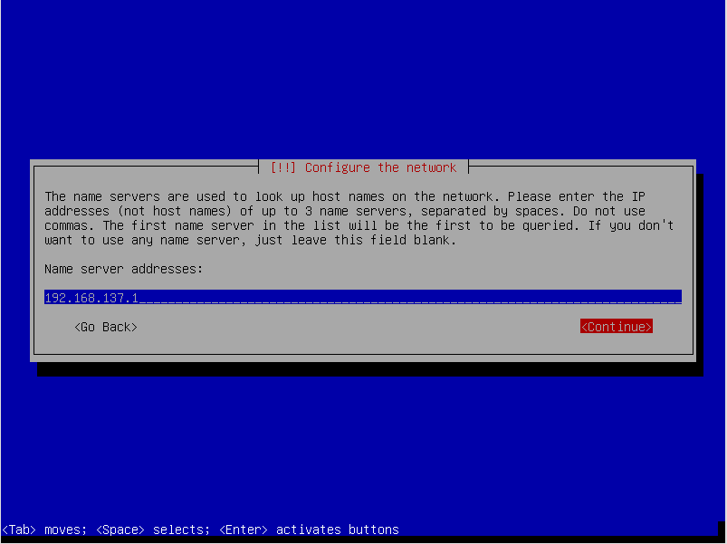 12. selanjutnya anda akan diminta memasukan ip dns anda dapat masukan ip yang sama dengan ip gateway atau anda dapat isikan dns google 8.8.8.8 tekan enter
