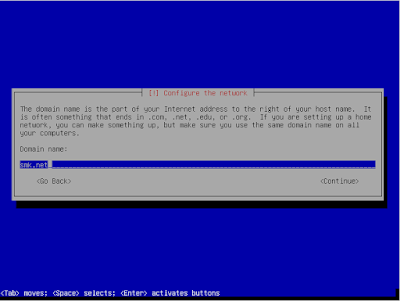 14. selanjutnya anda diminta memasukan nama domain , nama domain ini digunakan sebagai alias dari hostname atau jika server ini digunakan untuk publik anda dapat memasuakan domain yang anda miliki lalu tekan enter