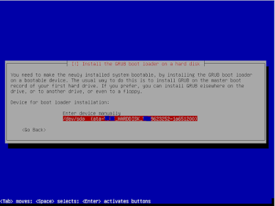 25. kemudian anda akan diminta memilih dimana master boot loader akan diinstall pilih "/dev/sda" atau hardisk anda tekan enter