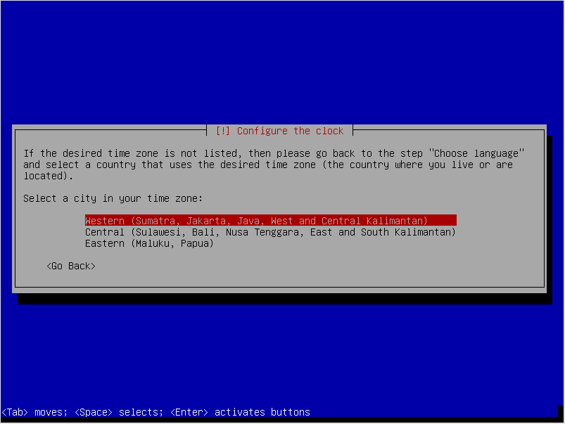 19. lalu anda akan diminta untuk memasukan time zone atau zona-zona waktu yang ada di indonesia silahkan pilih Western untuk WIB