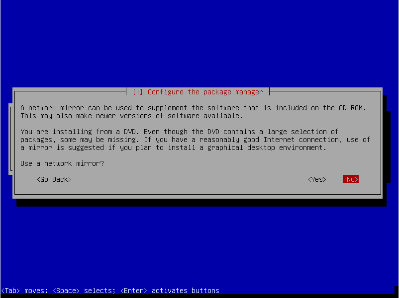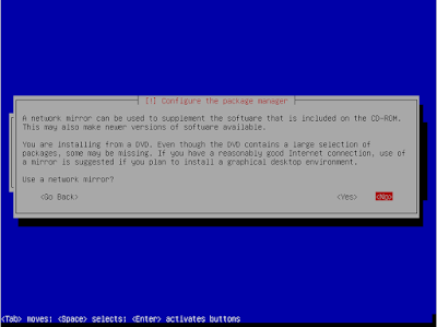 kemudian akan muncul seperti gambar diatas pilih "no" tekan enter jika anda tidak ingin menggunakan repository online jika anda ingin mengunakan repositori online maka anda silahkan pilih "yes" pilih "indonesia > kartolo.sby.datautama.net.id"