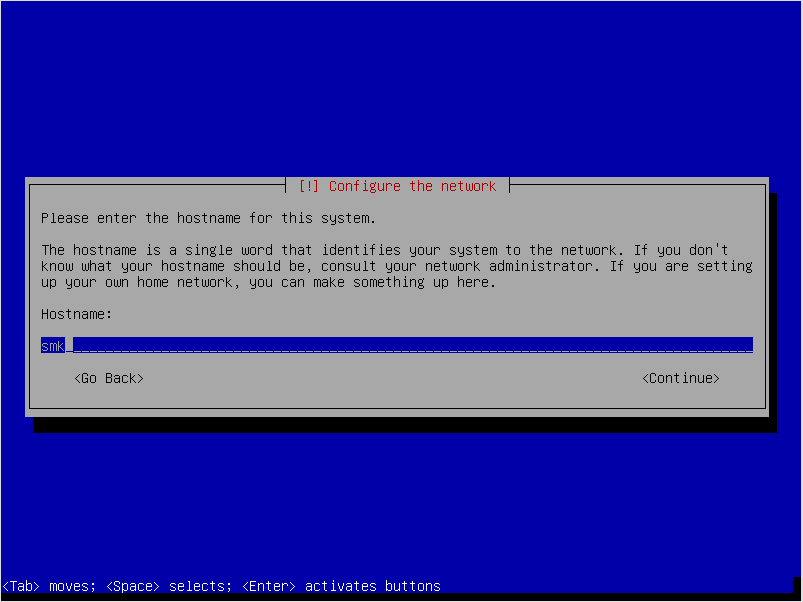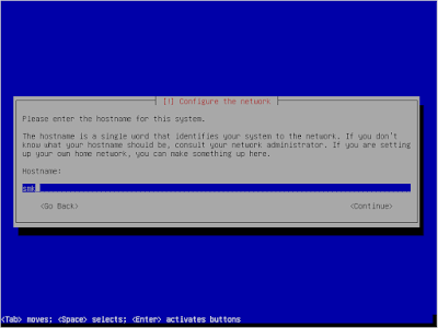 13.lalu anda diminta memasukan hostname , hostname adalah nama komputer anda yaitu tanda pengenal yang akan digunakan dalam suatu jaringan untuk mendeteksi keberadaan dan identitas komputer anda silahkan anda isi misal "smk" tekan enter