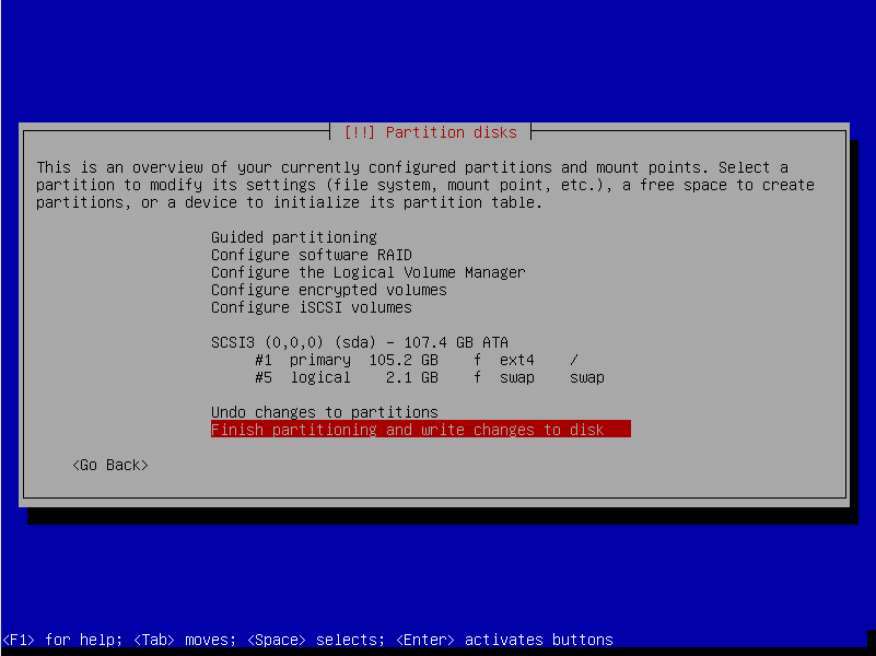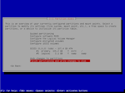 kemudian pilih "Finish partitioning and write changes to disk" dan tekan enter