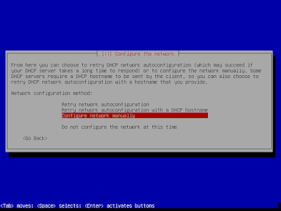 9. setelah itu anda bisa mengkonfigurasi ip anda terlebih dahulu dengan memilih "Configure network manully" tekan enter