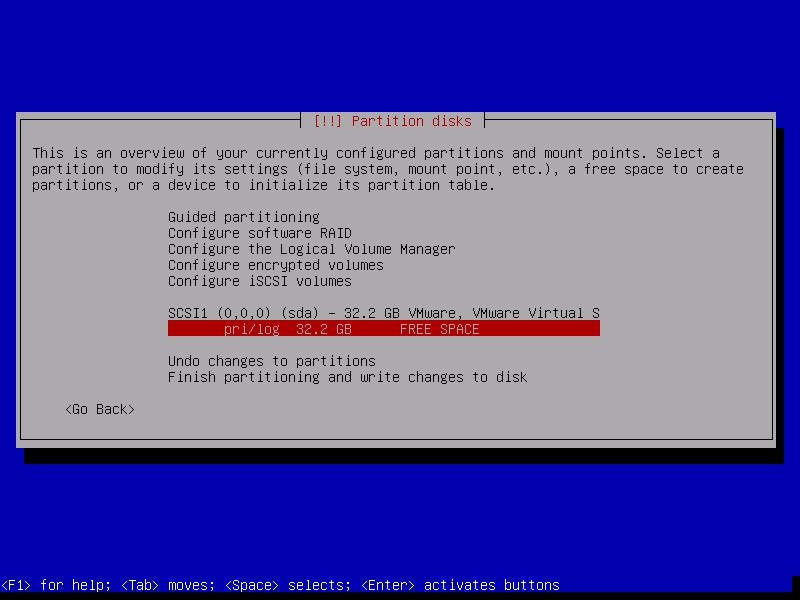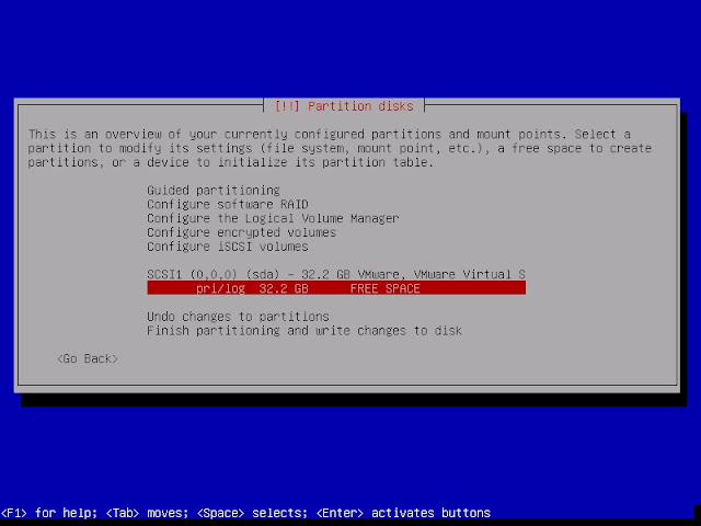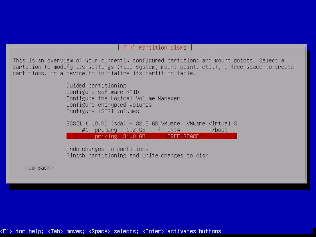 Selanjutnya, sistem akan menampilkan 2 partisi yang sudah kita buat masih ada free space hard disk yang akan kita gunakan untuk partisi swap. Pilih Free Space