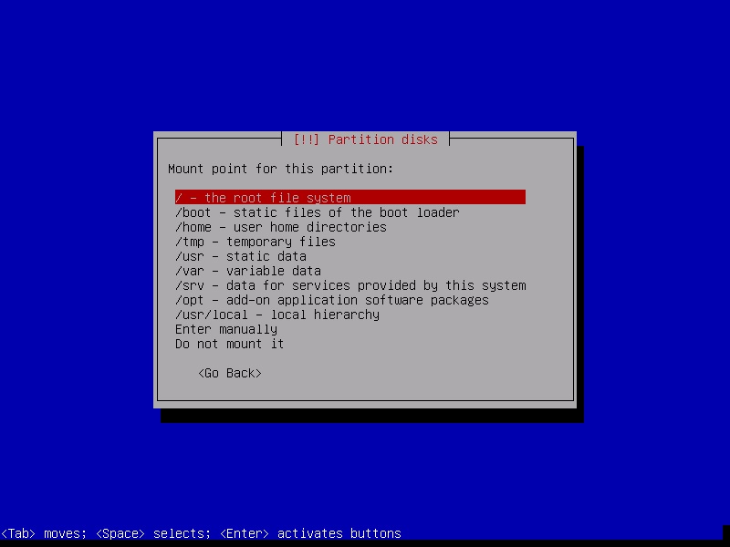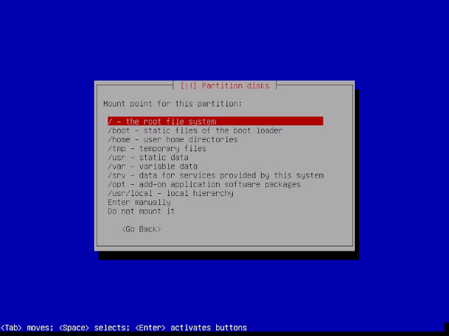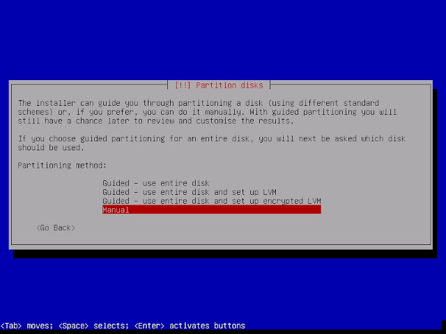 Pada tahapan adalah membuat dan pengaturan partisi, Debian GNU/Linux menyediakan 4 (empat) metode partisi. Pada panduan ini penulis menggunakan metode Manual