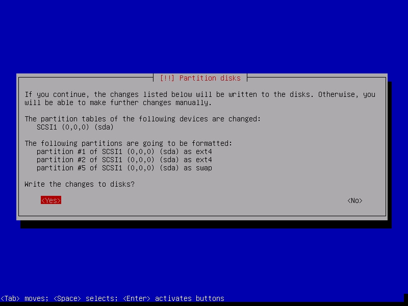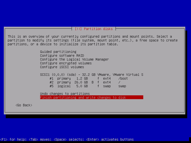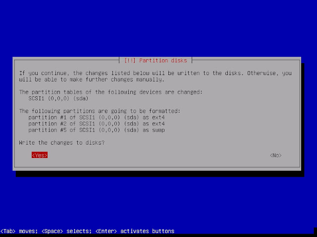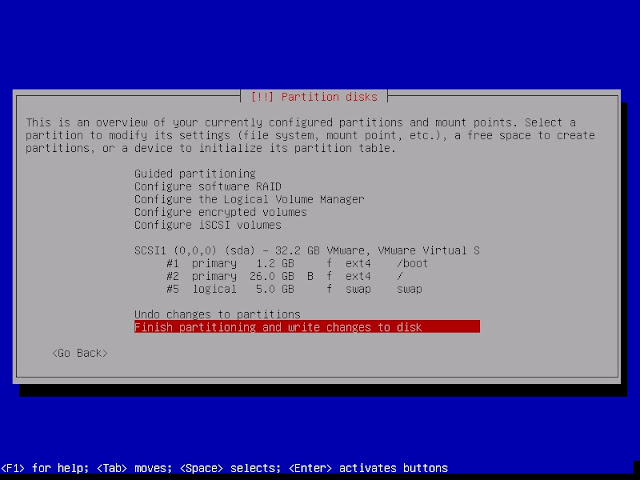 Proses pembuatan partisi /boot, / (root) dan swap sudah selesai, lanjutkan dengan memilih menu Finish partitioning dan write changes to disk.
