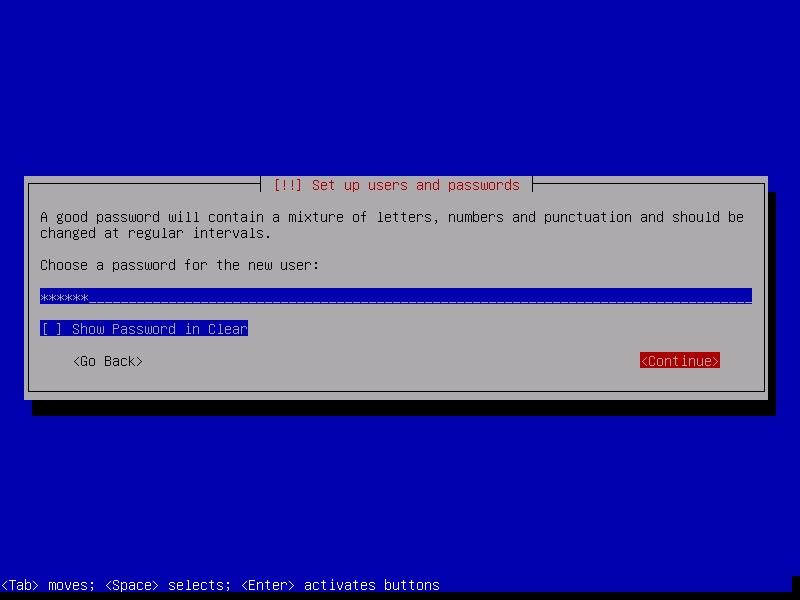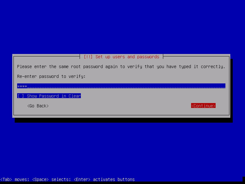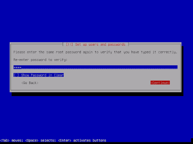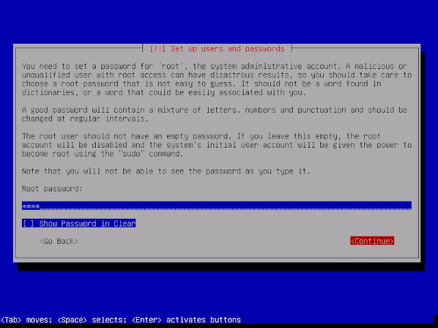 Ketikan Password untuk root dan pastikan Anda ingat apa password yang diketikan dan cukup aman karena password root adalah kata kunci yang paling penting dalam sistem GNU/Linux. Untuk memastikan apa yang Anda ketik sudah benar silakan pilih Option Show Password in Clear.