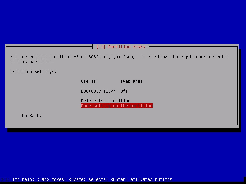 Untuk mengakhiri proses pembuatan parisi swap, pilih Done setting up the partition.