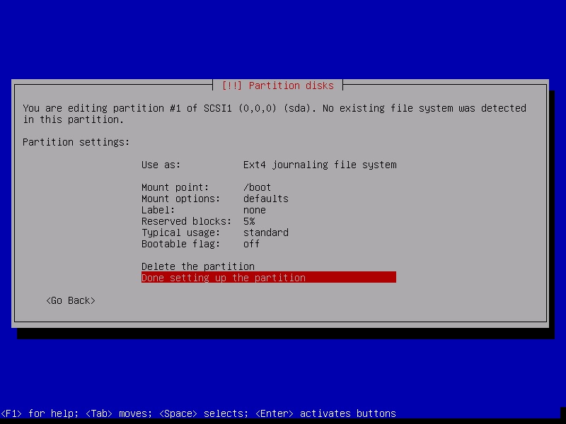 Selanjutnya, pilih setting partisi Mount Point : /boot, pilih option Done Setting up the partition untuk mengkahiri proses pembuatan partisi /boot.