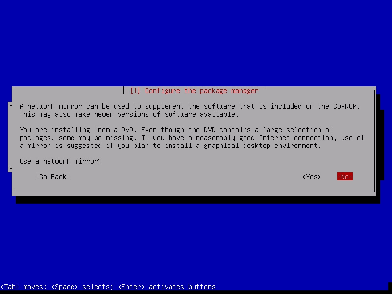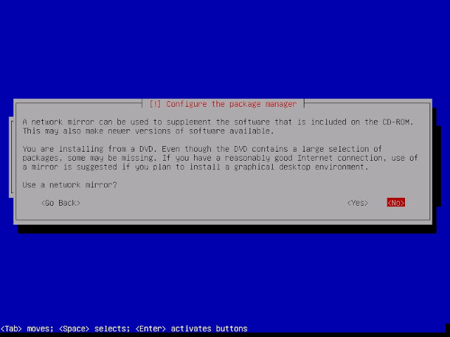 Proses selanjutnya sistem akan menanyakan apakah akan menggunakan alamat situs mirror dalam proses download dan instalasi paket-paket Debian 9. Apabila kita sudah memiliki CD/DVD Instalasi Debian yang lengkap dapat memilih opsi No.