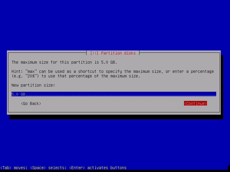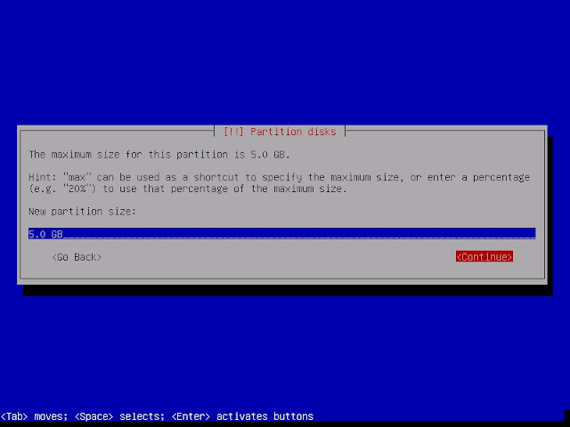 Selanjutnya, tentukan jumlah kapasaitas untuk partisi / (root), lanjutkan dengan memilik menu Continue dan ikuti perintah yang sudah direkomendasikan sistem.