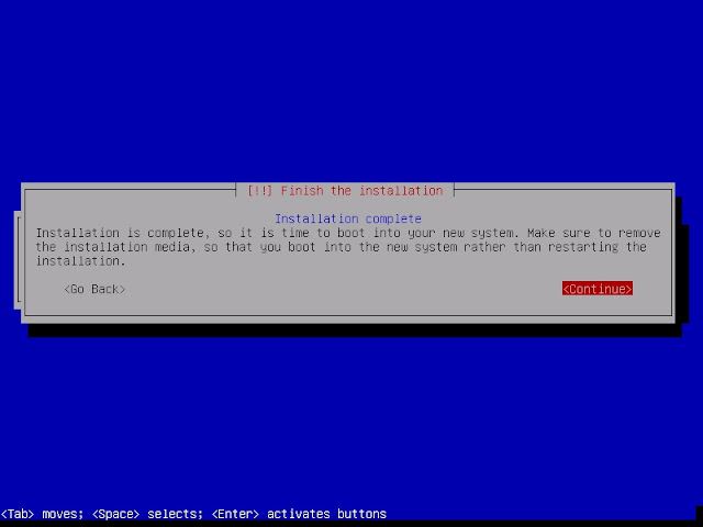 Pilih menu continue untuk mengakhiri proses instalasi Debian 9, sistem akan secara otomatis melakukan reboot