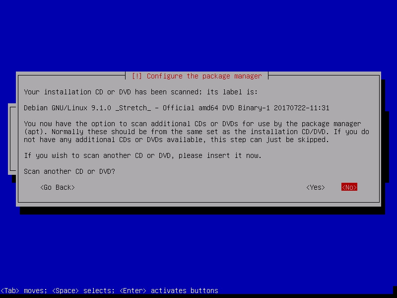Selanjtunya, sistem memberikan pilihan untuk proses scan CD/DVD tambahan untuk digunakan package manager (apt). Jika tidak ada CD/DVD tambahan pada proses ini bisa menjawab No.