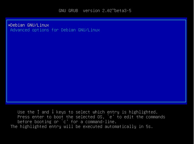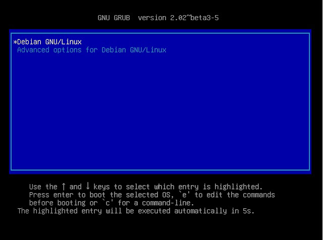 Tampilan GNU GRUB version 2.02 untuk Debian 9. Pilih opsi *Debian GNU/Linux untuk masuk ke sistem Debian 9.