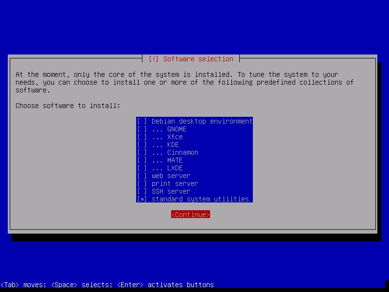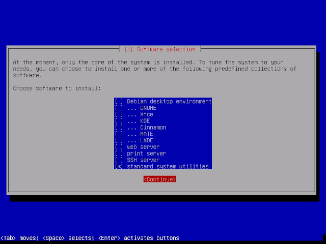 Selanjutnya, sistem meminta kita untuk memilih paket software yang akan kita install. Pada panduan ini kita hanya memilih Standart system utilities, untuk aplikasi server akan kita install setelah proses Instalasi Debian 9 selesai, sesuai dengan kebutuhan server yang akan kita bangun.