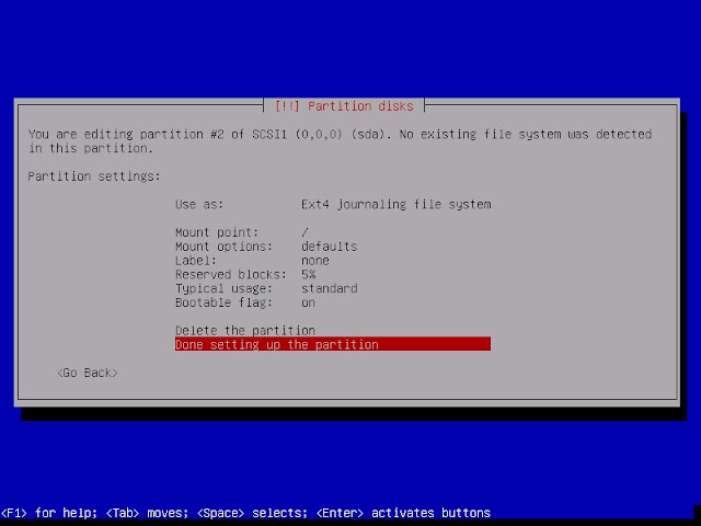 Selanjutnya, setelah memilih Mount Point : / setting juga Bootable flag : on. Untuk mengakhiri proses pembuat partisi / (root) pilih Done setting the partition.